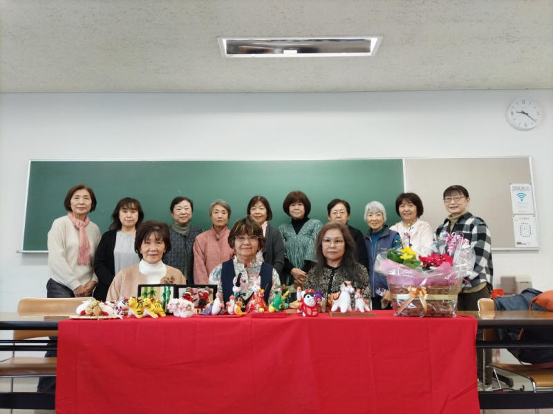 最後の制作は来年の干支「 午(ウマ)」で、11月25日から開催の「彩央会・美術展」出展に向けての総仕上げでした。干支の十二支と会員勢揃いして最後の記念撮影をしました。11年間も続いた「彩央会・女子会・手仕事サロン」、会員の皆さんの努力に支えられて続けて来れたことを、深く感謝しています。私の生涯の良き想い出となりました。彩央会の存続があってこそ、続けて来られましたが、継続については新たな方向性が見つけられず、会員の皆さん解散することで納得されました。